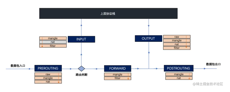 - iptables由表、链、规则组成;表包含链,链包含规则